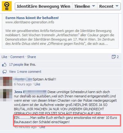 Kaum veröffentlicht, hagelte es darunter schon Beleidigungen und eine konkrete Morddrohung eines Fans der Identitären. Jens Peter E. meinte es sei lustig, wenn den sieben angesprochenen Antifaschist_innen der Schädel mit einer 10-Euro-Bauhaus-Axt gespalten wird.