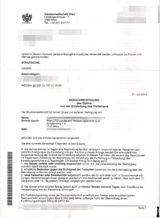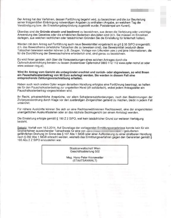 Nun habe ich die Benachrichtigung bekommen, dass das Verfahren eingestellt worden sei. Begründung: „Der Staatsanwalt hat keinen weiteren Grund zur Verfolgung von Jens Peter E.“ gesehen.