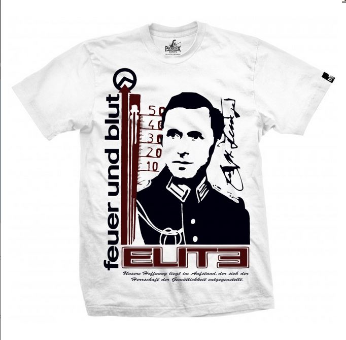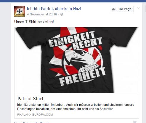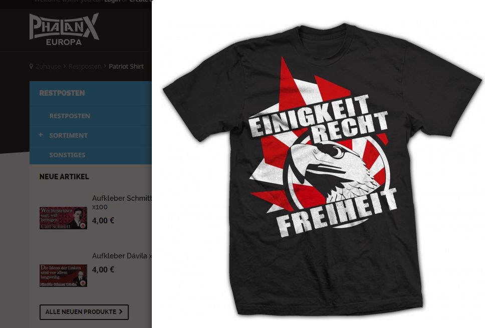 Der Schriftzug von Phalanx Europa ist im Stile von Lonsdale gehalten, so muss sich auch nicht das sonst so klassische Lonsdale-Publikum (von dem sich die Firma distanziert und antifaschistische Projekte sponsert) umgewöhnen. Phalanx Europa wird von Martin Sellner betrieben, der lange im Umfeld von Gottfried Küssel (dem Obernazi der Zweiten Republik in Österreich) aktiv war und mittlerweile die Identitäre Bewegung in Wien leitet. Bei so einem Shop bestellt der unbedarfte Lutz Bachmann also und trägt stolz ein schwarz, rot, weißes Shirt mit Adler und den Worten „Einigkeit, Recht, Freiheit“ (Anspielung auf die deutsche Nationalhymne).