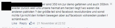 Aufruf zur Tat: Es geht auch nie, anders als von der Autorin behauptet, nur um einen selbst. Nein, alle anderen müssen genauso agitiert und EMOTIONALISIERT sein, wie man selbst. Wacht auf, ich habe die Wahrheit erkannt, wacht auch alle mit mir auf. Was ist das Ziel? Alle sollen nun gegen Flüchtlinge sein, wie die Autorin selbst? Sollen wir alle nun vor Flüchtlingsunterkünften protestieren? Sollen wir diesen männlichen Flüchtlingen endlich mal klar machen, dass wir gegen sie sind? Was genau wir machen sollen, wenn wir aufgewacht sind, diese Antwort bleibt die Autorin, bewusst oder unbewusst, schuldig. Rechtsextreme Organisationen nutzen diese Auslassungen sehr gezielt. Sie machen Stimmung z.B. gegen eine Flüchtlingsunterkunft, dann posten sie nur die Adresse, ohne konkrete Ansage warum eigentlich. Brauchen sie auch nicht mehr.