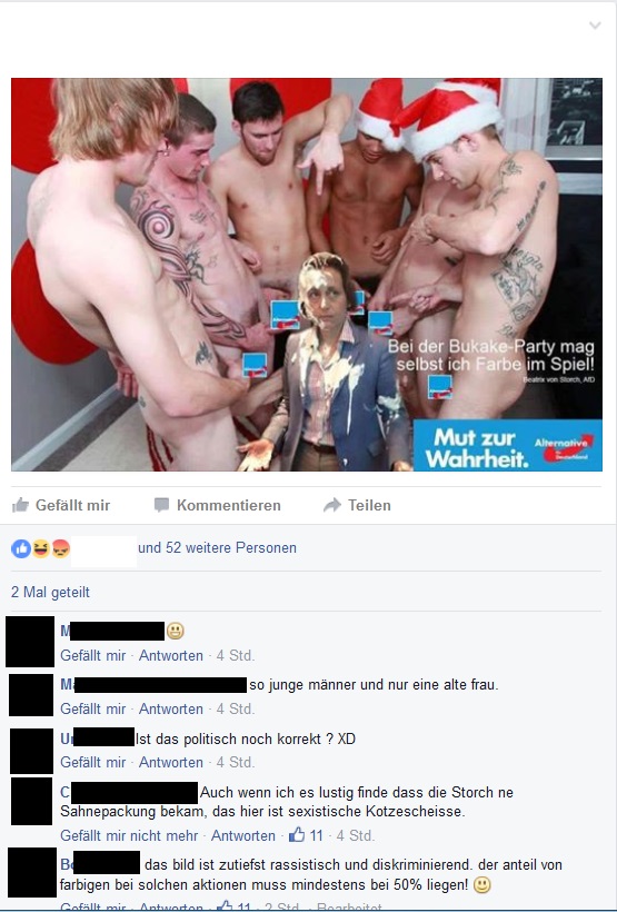 Die getortete Frau Storch wird als Opfer einer „Bukake-Party“ (so auch die Bildunterschrift) inszeniert. Das bedeutet, dass behauptet wird, Storch sei in einem Kreis junger Männer gewesen, die auf sie ejakuliert haben. Ihr unglücklicher Gesichtsausdruck (der von der Tortung rührt) suggeriert, dass sie das nicht toll findet. Der Witz des Bildes ist also, dass Männer gemeinschaftlich auf eine Frau abgespritzt haben, ohne dass die das wollte. Dieser Vorgang hat einen Namen und er nennt sich Vergewaltigung. Es ist völlig egal, dass es sich bei dieser Frau um Storch handelt, denn sie ist nur mehr Platzhalterin für jede unliebige Frau. Die einen Männer montieren Frau Storch hinein, die Nächsten Sara Wagenknecht oder im persönlichen Kontext die Ex-Freundin. Ziel ist es, die Frau in ihrer Rolle als Frau der Lächerlichkeit preis zu geben, denn eine Vergewaltigung (so die Annahme) ist peinlich für das Opfer. Die Männer haben sich einen Spaß gemacht und dieser unliebigen Frau gezeigt, wie der Hase läuft. Es ist dezidiert keine Kritik an Storchs Politik, sondern einzig und allein eine Herabwürdigung ihrer Person, weil sie eine Frau ist.