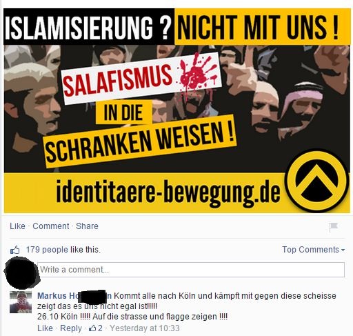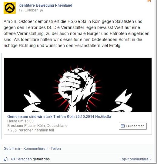 Ergänzung: Die Begeisterung dürfte auf Gegenseitigkeit beruhen, so teilt doch die offizielle Facebookseite von “Hooligans gegen Salafismus” mit dem Namen “Gemeinsam sind wir stark” Sujets der Identitären: