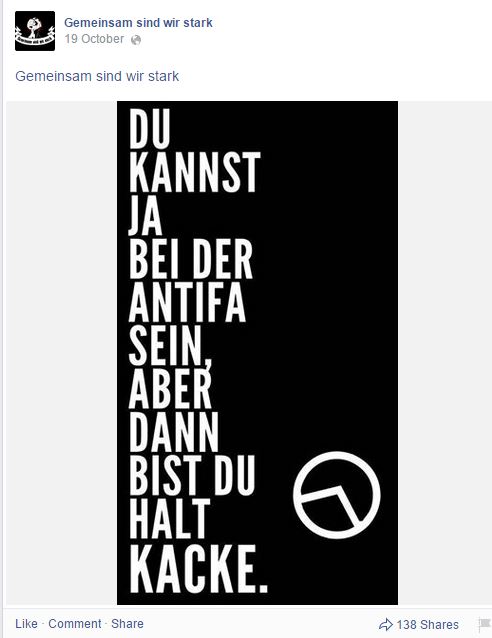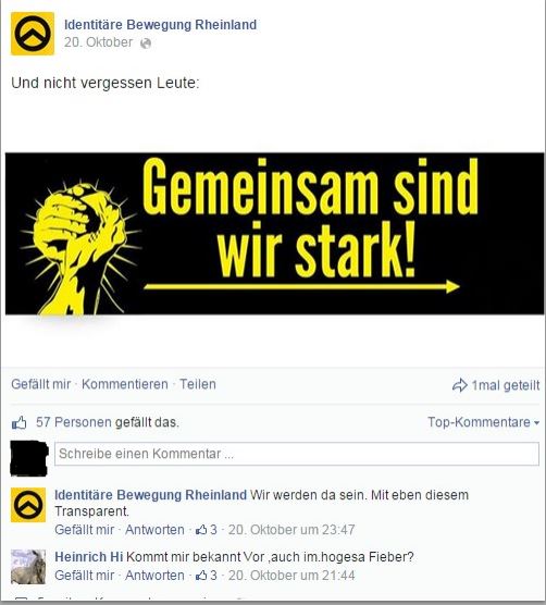 Sie sind, zumindest auf facebook, recht aktiv und teilen auch gerne Berichte der Identitären aus Österreich. Der Kontakt ist so eng, dass die Rheinländer_innen auch bei der Minidemo der Identitären in Wien dabei waren.