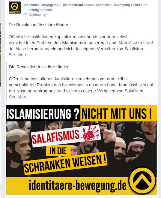 Die Identitäre Bewegung Deutschland ist da verklausulierter und ruft nicht direkt zur Demo auf. Sie liefert aber ideologisch den passenden Stoff wenige Tage davor. Ein Aufruf zur Demo zu gehen, darf selbstverständlich darunter stehen bleiben.