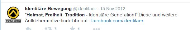 Identitäre Bewegung – die Identitären als rechtsextreme Spaßbewegung mit der corporate identity gibt es seitdem in Potiers im Herbst 2012 kurzfristig eine Moschee besetzt wurde und das Lambda-Symbol auf einem Banner entrollt wurde. In Deutschland und Österreich fallen sie vor allem im Internet oder mit pseudolustigen Aktionen auf. Die Identitäre Bewegung Deutschland verlautbarte am 28. Februar 2014 auf Facebook, dass sie an diesem Kongress der JN nicht teilnehmen werde, da sich hier eine Szene treffe, „deren Ideologie sie nicht teilen“. Die Veranstalter_innen selbst beharren aber auch auf Nachfrage darauf, dass Vertreter_innen der Identitären anwesend sein werden. Denn auch wenn hier eine brüske Zurückweisung erfolgte, so gibt es durchaus Überschneidungen zwischen Neonazi-Szene und den Identitären, wie in diesem Buch aufgeschlüsselt (kaufen!).