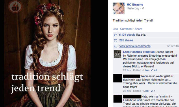 So hat er ein Sujet mit einem Bild aus dem Katalog der Designerin Lena Hoschek geteilt. Dieses stammt von den Identitären und zeigt auch das Logo ihrer tumblr-Seite „Wirkungsfeuer“.